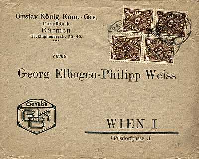 Auslandsbrief (21-100 g) vom 28.05.1923 (13. Periode) frankiert mit 4 Marken a 30 Mark (=120 Mark); nach Österreich galt der Inlandstarif |