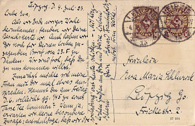 Ortspostkarte vom 04.07.1923 (14. Periode) frankiert mit 2 Marken a 30 Mark (=60 Mark) |