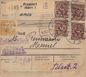Auslandspaketkarte (2 400 g, > 75 km) vom 14.12.1922 (10. Periode) frankiert mit 4 Marken a 30 Mark (=120 Mark); in das Memelgebiet galt der Inlandstarif |
