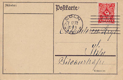 Ortspostkarte vom 02.12.1922 (10. Periode) frankiert mit einer Marke a 3 Mark (=3 Mark) |