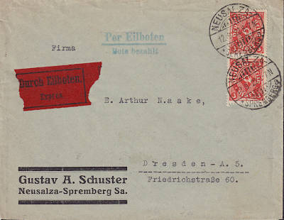 Inlandsbrief mit Eilzustellung (1-20 g) vom 12.09.1922 (8. Periode) frankiert mit 2 Marken a 3 Mark (=6 Mark, 3 Brief 3 Eilzustellung) |