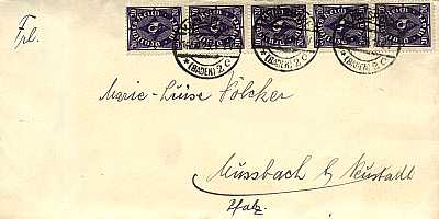 Inlandsbrief (1-20 g) vom 16.04.1923 (13. Periode) frankiert mit 5 Marken a 20 Mark (=100 Mark) |