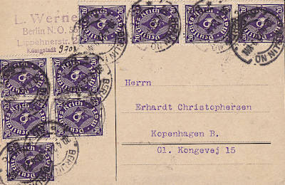 Auslandspostkarte vom 30.04.1923 (13. Periode) frankiert mit 9 Marken a 20 Mark (=180 Mark) |