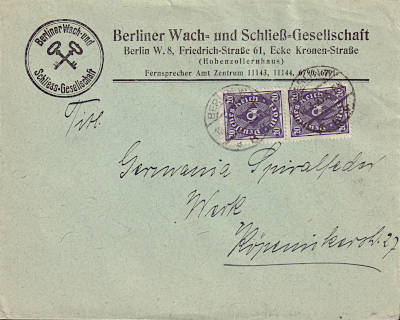 Ortsbrief (1-20 g) vom 18.03.1923 (13. Periode) frankiert mit 2 Marken a 20 Mark (=40 Mark) |