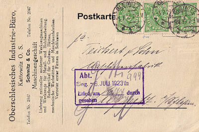 Inlandspostkarte vom 05.07.1923 (14. Periode) frankiert mit 3 Marken a 40 Mark (=120 Mark) |