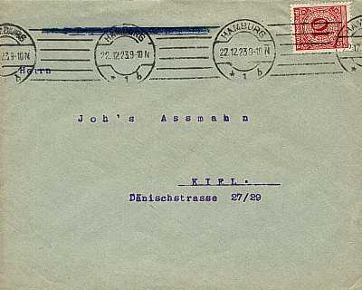 Inlandsbrief (1-20 g) vom 22.12.1923 (27. Periode) frankiert mit einer Marke a 10 Pfennig (=10 Pfennig)