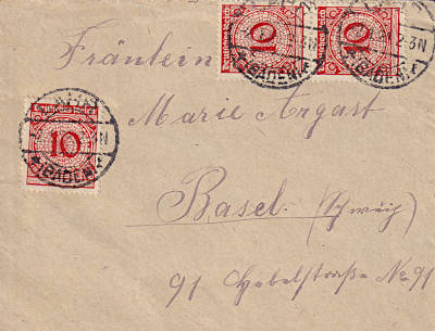 Auslandsbrief (1-20 g) vom 02.01.1924 (27. Periode) frankiert mit 3 Marken a 10 Pfennig (=30 Pfennig)