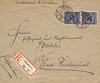 Inlandsbrief mit Einschreiben (21-500 g) vom 13.06.1924 (27. Periode) frankiert mit 2 Marken a 20 Pfennig (=40 Pfennig, 20 Brief 20 Einschreiben)