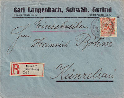 Inlandsbrief mit Einschrieben (21-250 g) vom 16.03.1925 (27. Periode) frankiert mit einer Marke a 50 Pfennig (=50 Pfennig, 20 Brief 30 Einschreiben) |