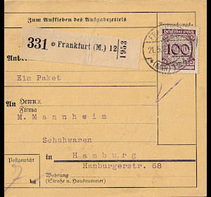 Inlandspaketkarte (7 000 g, 75-375 km) vom 21.05.1924 (27. Periode) frankiert mit einer Marke a 100 Pfennig (=1 Mark)