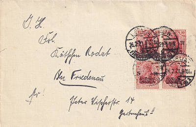 Ortsbrief (1-20 g) vom 26.02.1921 (5. Periode) frankiert mit 4 Marken a 10 Pfennig(=40 Pfennig)