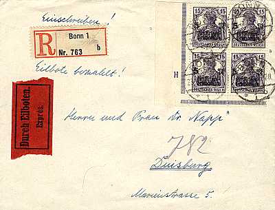 Inlandsbrief mit Einschreiben und Eilzustel- lung (1-20 g) vom 23.06.1919 (3. Periode) frankiert mit 4 Marken a 15 Pfennig (=60 Pfennig, 15 Brief 20 Einschreiben 25 Eilzustellung) |