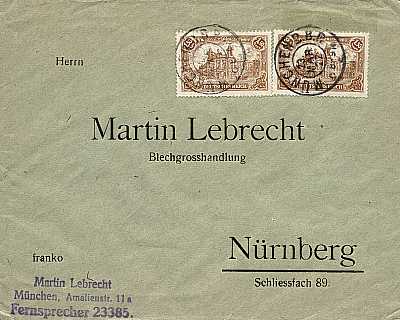 Inlandsbrief (21-100 g) vom 23.03.1922 (7. Periode) frankiert mit 2 Marken a 1,50 Mark (=3 Mark) |