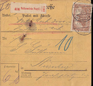 Inlandspaketkarte mit Wertangabe (3 000 Mark) (6 000 g, > 75 km) vom 09.10.1920 (5. Periode) frankiert mit 7 Marken a 1,50 Mark (=10,50 Mark, 4 Paket 0,50 Einschreiben 6 Wert) |