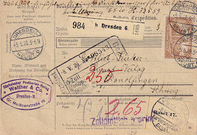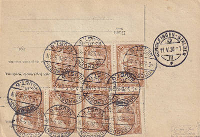 Auslandspaketkarte (4 000 g) vom 05.05.1920 (4. Periode) frankiert mit 8 Marken a 1,50 Mark (=12 Mark) |