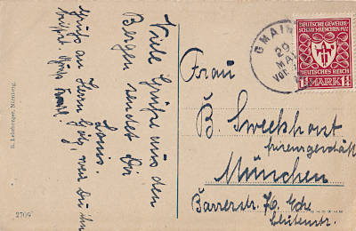 Inlandspostkarte vom 29.05.1922 (7. Periode) frankiert mit einer Marke a 1¼ Mark(=1,25 Mark)