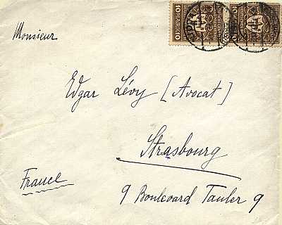 Auslandsbrief (1-20 g) vom 03.11.1922 (9. Periode) frankiert mit 2 Marken a 10 Mark (=20 Mark) |