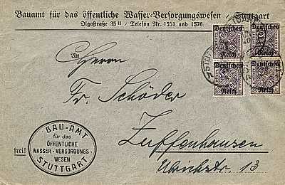 Inlandsbrief (21-250 g) vom 05.06.1920 (5. Periode) frankiert mit 4 Marken a 15 Pfennig (=60 Pfennig)