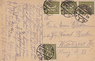 Inlandspostkarte vom 22.11.1921 (6. Periode) frankiert mit 4 Marken a 10 Pfennig (=40 Pfennig) |