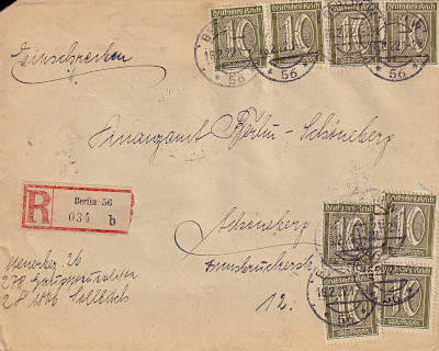 Ortsbrief mit Einschreiben (21-250 g) vom 16.02.1922 (7. Periode) frankiert mit 40 Marken a 10 Pfennig (=4 Mark, 2 Brief 2 Einschreiben) |