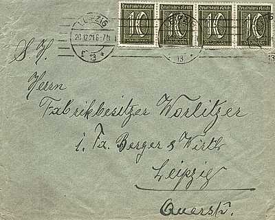 Ortsbrief (1-20 g) vom 20.12.1921 (6. Periode) frankiert mit 4 Marken a 10 Pfennig (=40 Pfennig) |