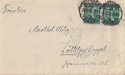 Inlandsbrief (1-20 g) vom 24.12.1921 (6. Periode) frankiert mit 2 Marken a 30 Pfennig (=60 Pfennig) |