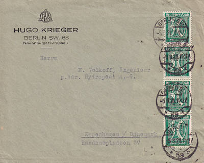 Auslandsbrief (1-20 g) vom 05.08.1921 (6. Periode) frankiert mit 4 Marken a 30 Pfennig (=1,20 Mark) |