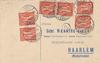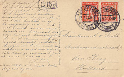 Auslandspostkarte vom 13.09.1921 (6. Periode) frankiert mit 2 Marken a 40 Pfennig (=80 Pfennig) |