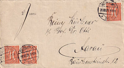 Auslandsbrief (1-20 g) vom 21.10.1921 (6. Periode) frankiert mit 3 Marken a 40 Pfennig (=1,20 Mark) |