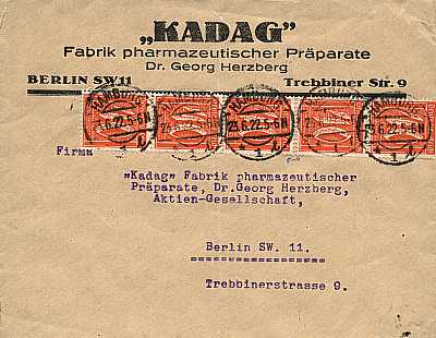 Inlandsbrief (1-20 g) vom 23.06.1922 (7. Periode) frankiert mit 5 Marken a 40 Pfennig (=2 Mark) |