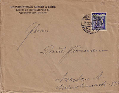 Inlandsdrucksache (21-50 g) vom 16.09.1922 (8. Periode) frankiert mit einer Marke a 75 Pfennig (=75 Pfennig)