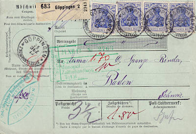 Auslandspaketkarte (3 500 g) vom 23.12.1913 frankiert mit 4 Marken a 20 Pfennig (=80 Pfennig)