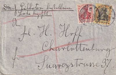 Inlandsbrief mit Eilzustellung vom 05.04.1916 frankiert mit einer Marke a 25 Pfennig (=25 Pfennig; 0 Brief 25 Eilzustellung); bei dieser gebührenfreien Dienstsendung