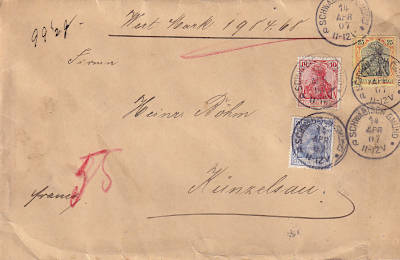 Inlandsbrief mit Wertangabe (1 984,68 Mark) (99,5 g, < 75 km) vom 14.04.1907 frankiert mit 3 Marken (=55 Pfennig, 20 Brief 35 Wert) |