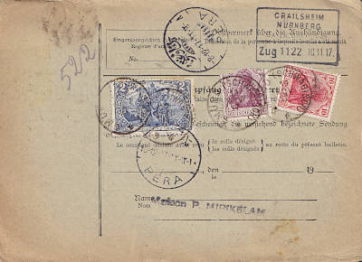Auslandspaketkarte mit Wertangabe (400 Mark) (5 000 g) vom 10.11.1917 frankiert mit 3 Marken (=2,70 Mark)