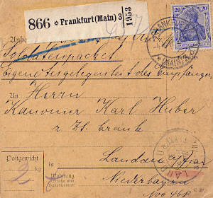 Inlandspaketkarte für ein Soldatenpaket (2 000 g) vom 04.04.1917 frankiert mit einer Marke a 20 Pfennig (=20 Pfennig) |