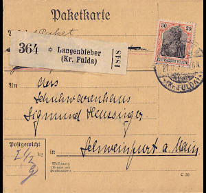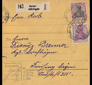 Inlandspaketkarte (1 000 g, > 75 km) vom 05.04.1918 frankiert mit 2 Marken a 30 Pfennig (=60 Pfennig) |