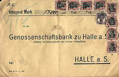 Inlandsbrief mit Wertangabe (17 000 Mark) (71,5 g, < 75 km) vom 05.08.1918 frankiert mit 9 Marken (=3,35 Mark, 0,25 Brief 3,15 Wert)