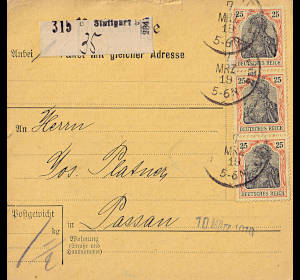 Inlandspaketkarte (1 500 g,> 75 km) vom 09.03.1919 frankiert mit 3 Marken a 25 Pfennig (=75 Pfennig)