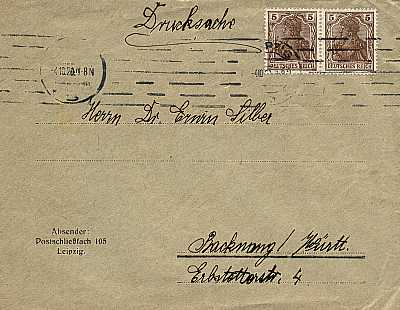 Inlandsdrucksache (1-50 g) vom 04.10.1920 frankiert mit 2 Marken a 5 Pfennig (=10 Pfennig) |