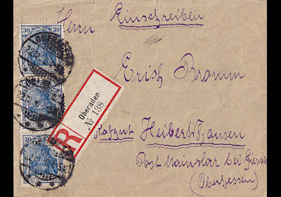 Inlandspaketkarte mit Einschreiben (12 000 g, > 75 km) vom 20.07.1920 frankiert mit 4 Marken (=8,50 Mark, 8 Paket 0,50 Einschreiben) |