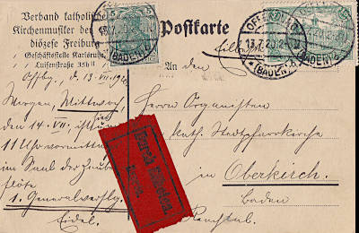 Inlandspostkarte mit Eilzustellung vom 13.07.1920 frankiert mit 2 Marken (=1,30 Mark, 0,30 Postkarte 1 Eilzustellung) |