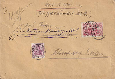Inlandspaketkarte mit Wertangabe (3 000 Mark) (6 000 g, > 75 km) vom 09.10.1920 frankiert mit 7 Marken a 1,50 Mark (=10,50 Mark, 4 Paket 0,50 Einschreiben 6 Wert) |