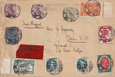 Inlandsbrief mit Eilzustellung und Luftpost (101-250 g) vom 09.03.1921 frankiert mit 10 Marken (=4 Mark, 0,60 Brief 1 Eilzustellung 2,40 Luftpost) |