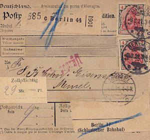 Auslandspaketkarte (9 000 g, > 75 km) vom 09.08.1921 frankiert mit 2 Marken a 4 Mark (=8 Mark) |