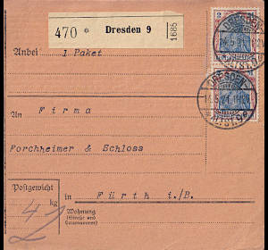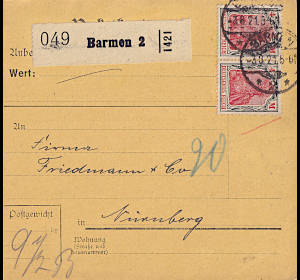 Inlandspaketkarte (9 500 g, > 75 km) vom 03.08.1921 frankiert mit 2 Marken a 4 Mark (=8 Mark) |