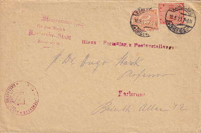 Ortsbrief mit Zustellungsurkunde (1-20 g) vom 10.05.1921 frankiert mit 2 Marken (=1,30 Mark, 0,40 Brief 0,50 Zustellung 0,40 Urkunde) |