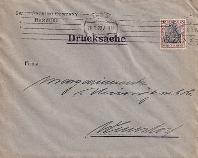 Inlandsdrucksache (1-50 g) vom 22.02.1922 frankiert mit einer Marke a 50 Pfennig (=50 Pfennig) |
