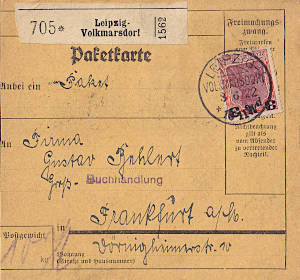 Inlandspaketkarte (2 500 g, > 75 km) vom 23.05.1922 frankiert mit 12 Marken a 75 Pfennig (=9 Mark) |