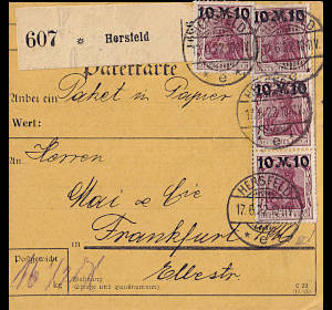 Inlandspaketkarte (16 500 g, > 75 km) vom 17.06.1922 frankiert mit 4 Marken a 10 Mark auf 75 Pfennig (=40 Mark) |